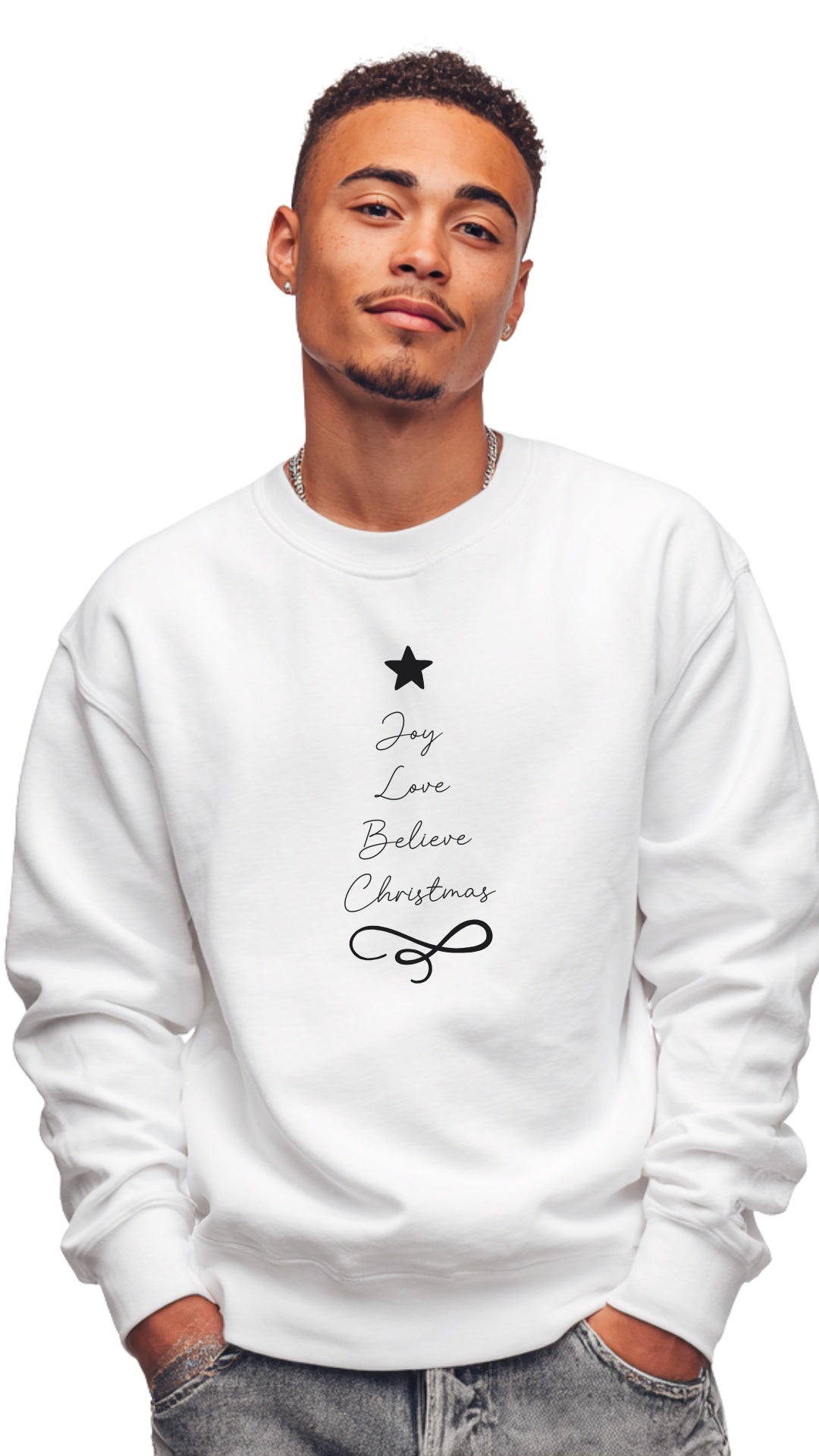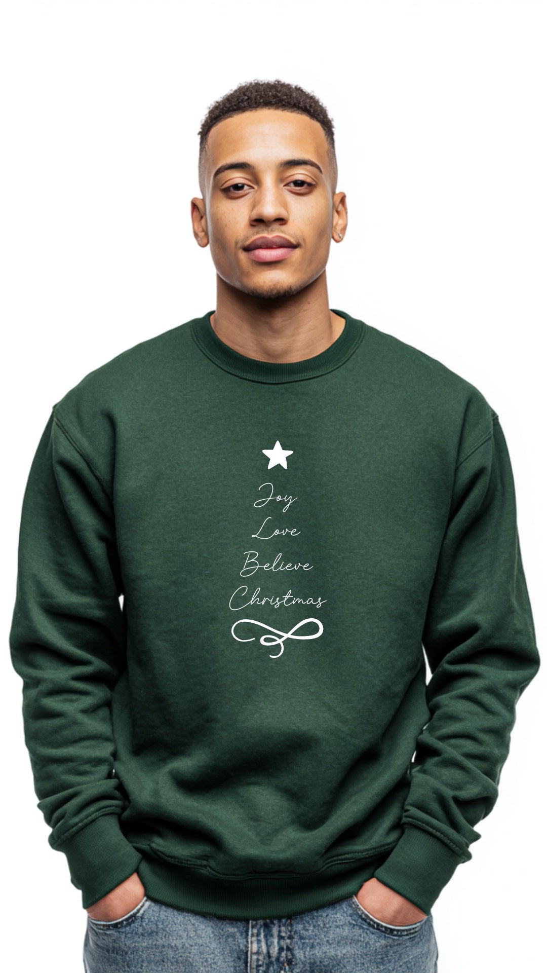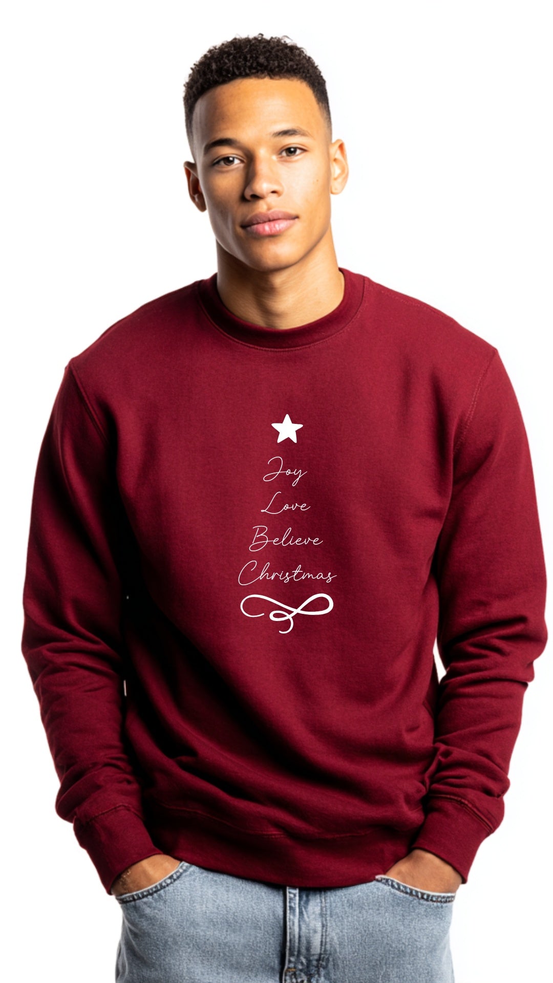 Spread positivity and festive spirit with our Joy Love Believe Christmas Sweater, featuring the words beautifully arranged in the shape of a Christmas tree. A statement piece that’s cheerful, meaningful, and effortlessly stylish for any occasion this season.