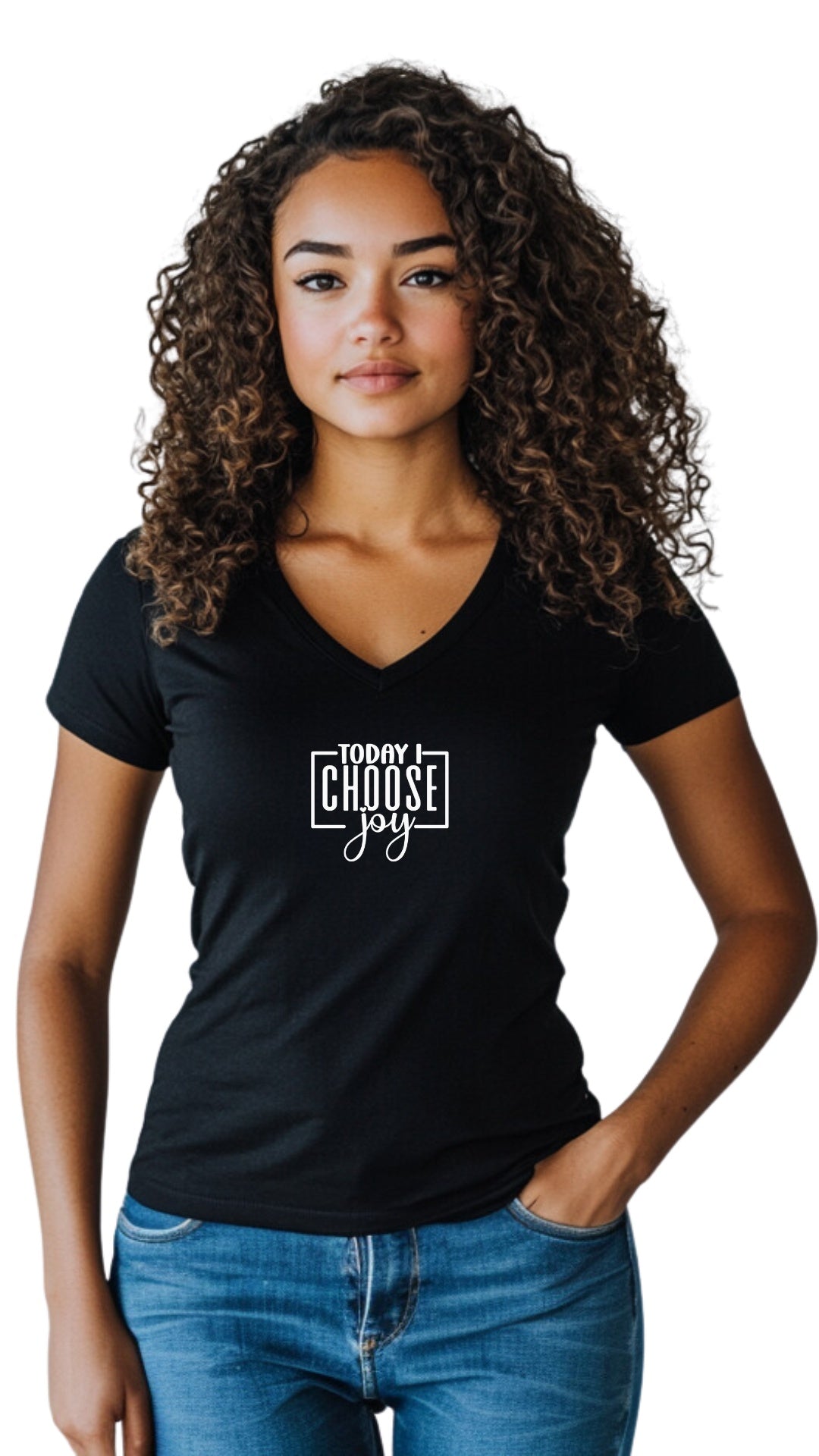 Brighten your day and everyone around you with our "Today I Choose Joy" V-neck T-shirt. The uplifting message serves as a gentle reminder to embrace positivity and find joy in every moment. With its comfortable fit and flattering neckline, this tee effortlessly combines style and inspiration, making it perfect for both casual outings and relaxed days. Choose joy, choose happiness, and wear it proudly.