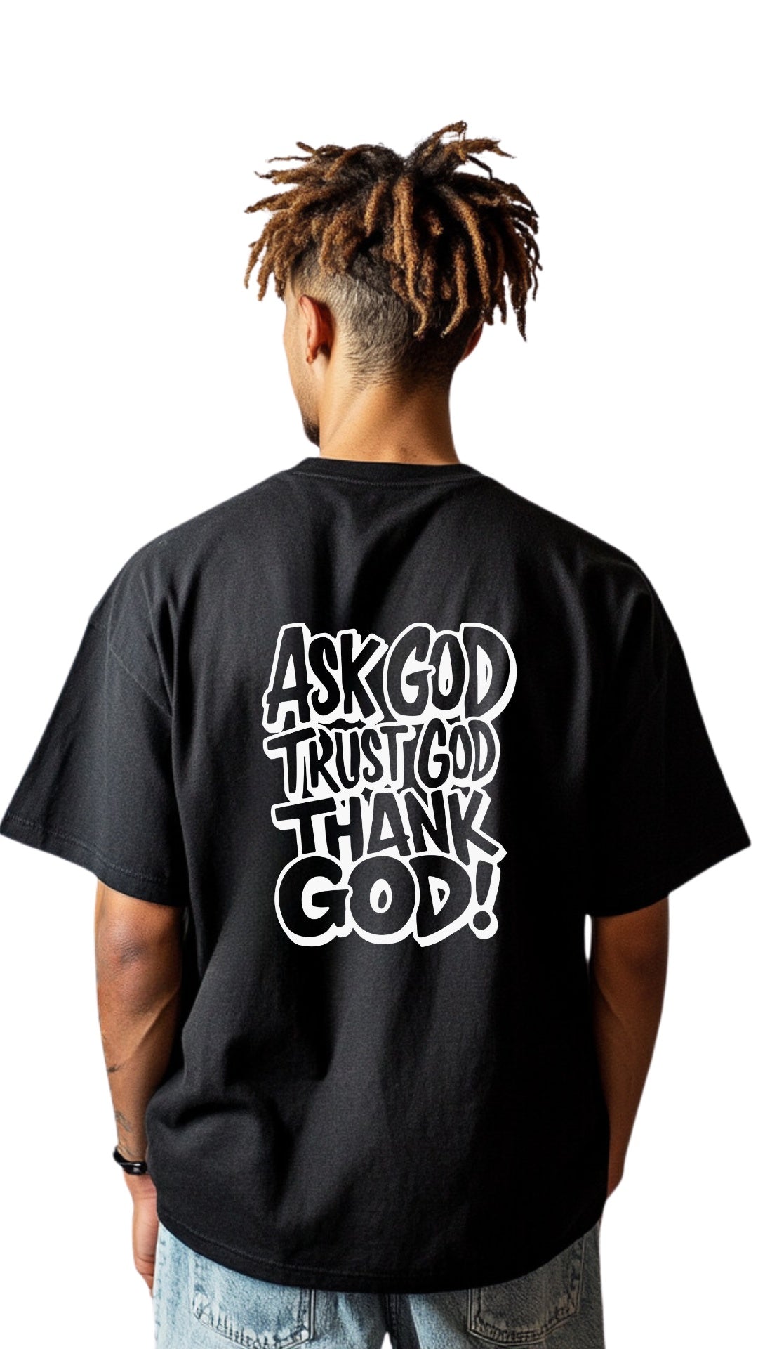 The Oversized Tee with the phrase "Ask God, Trust God, Thank God" is designed to inspire a deeper connection to faith. This tee serves as a reminder to approach life with prayer, trust, and gratitude, no matter the circumstances. The oversized fit provides ultimate comfort, while the powerful message speaks to the heart of anyone who seeks to live a life grounded in faith.