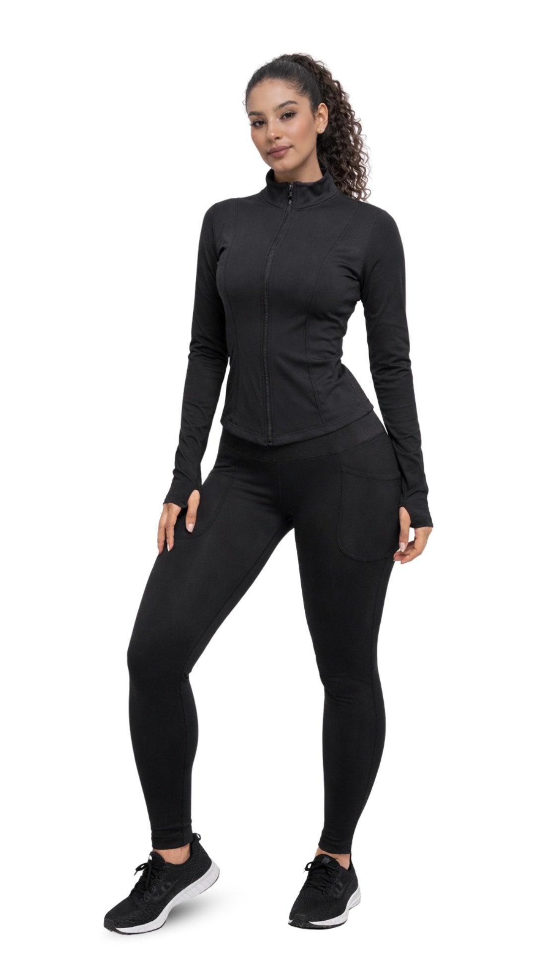 Designed for movement, comfort, and everyday wear, this gym set combines a soft, stretchy performance fabric with a sculpting fit. The zip-up jacket features functional front pockets and thumb-hole sleeves for added coverage and convenience, while the leggings include side pockets to keep essentials close. Crafted from 80% polyester and 20% elastane, the fabric feels smooth, breathable, and flexible — perfect for workouts, errands, or casual styling.
